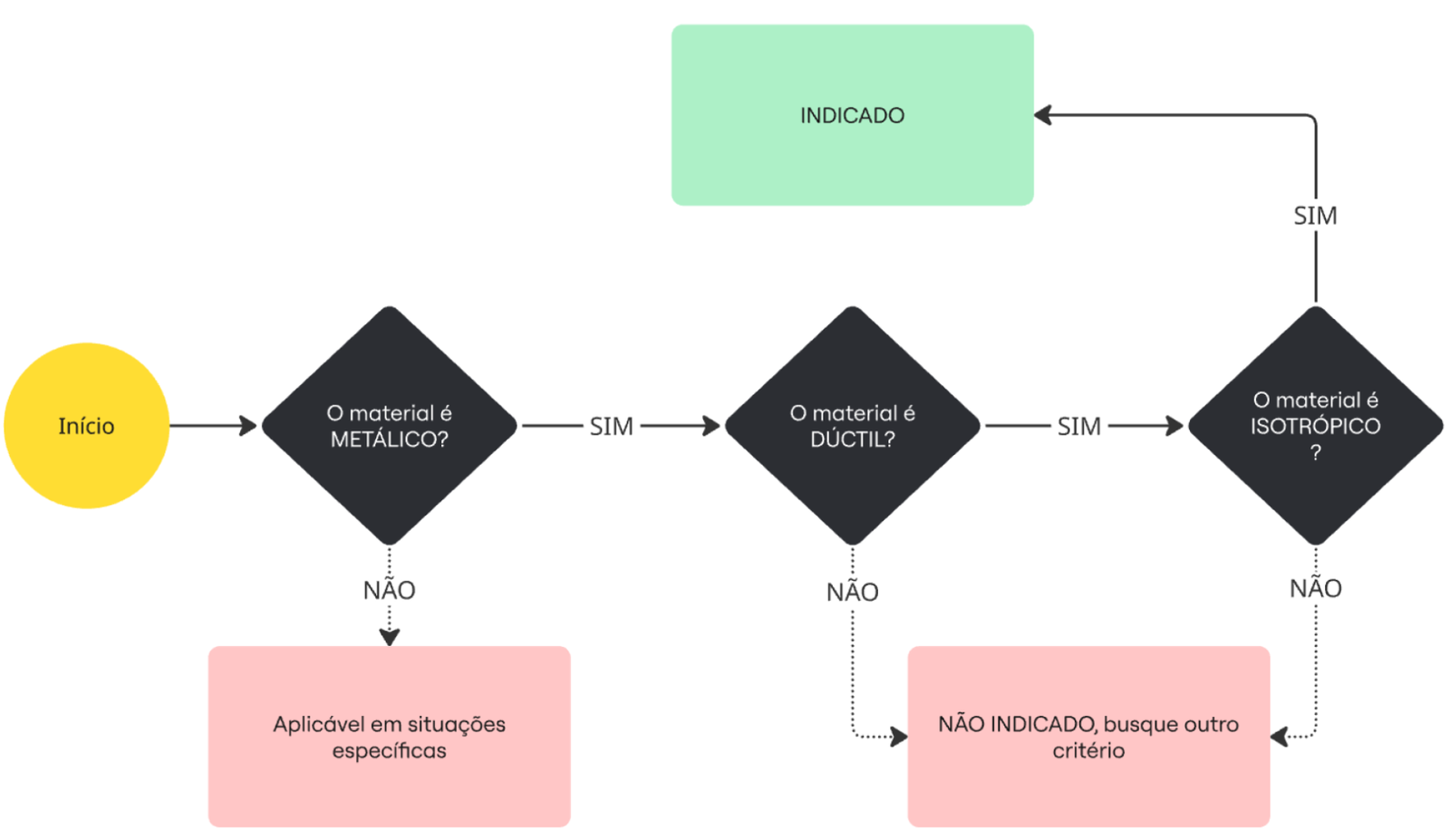 Logo, temos o critério de von Mises, onde a condição de escoamento ocorre quando a tensão equivalente de von Mises é maior que a tensão de escoamento do material: